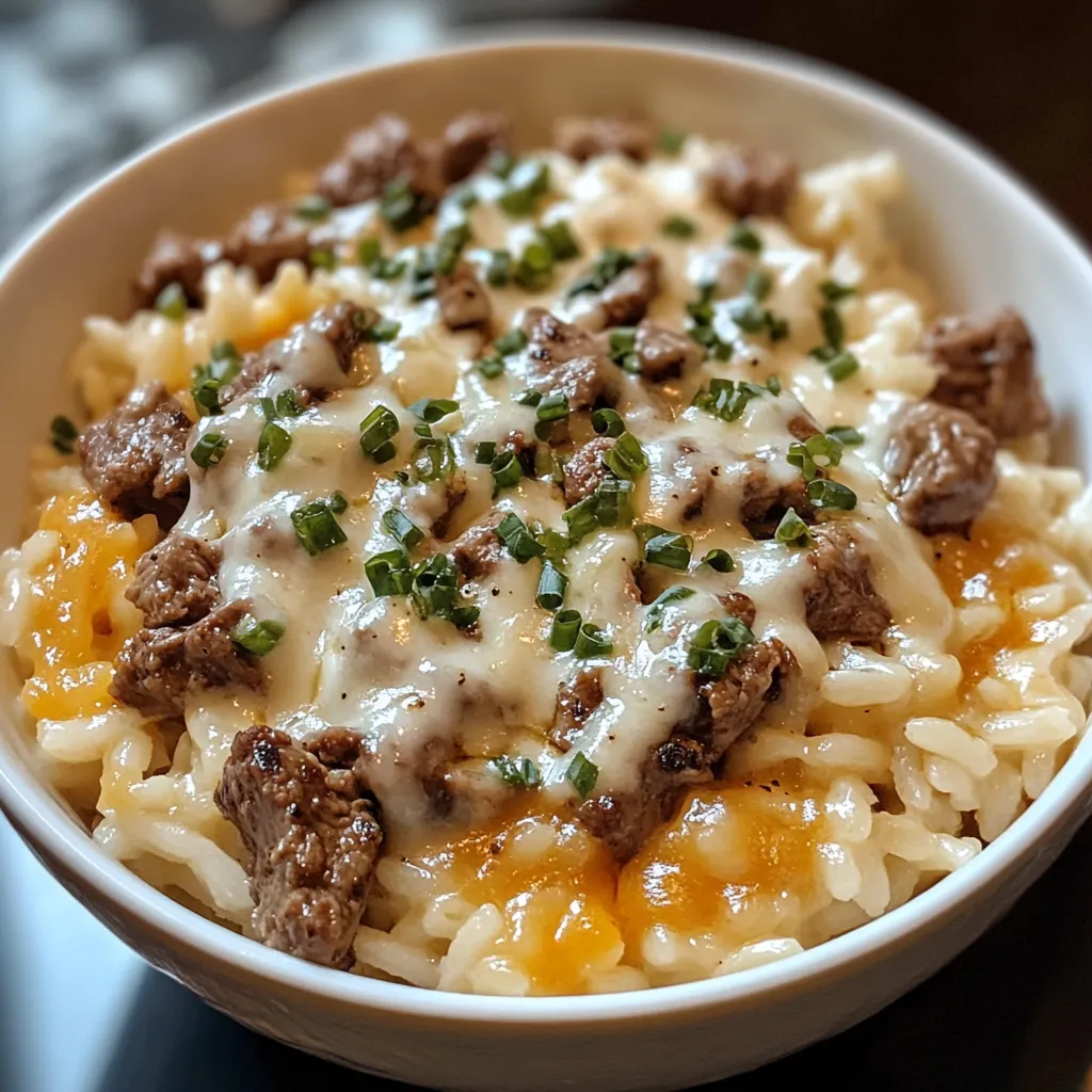 The combination of buttery beef, tender rice, and a creamy garlic cheese sauce feels like classic comfort food. As it cooks, you’ll notice the smell of garlic and beef filling the kitchen almost immediately, and by the end, you’re left with a warm, spoonable bowl that feels like a hug after a long day.