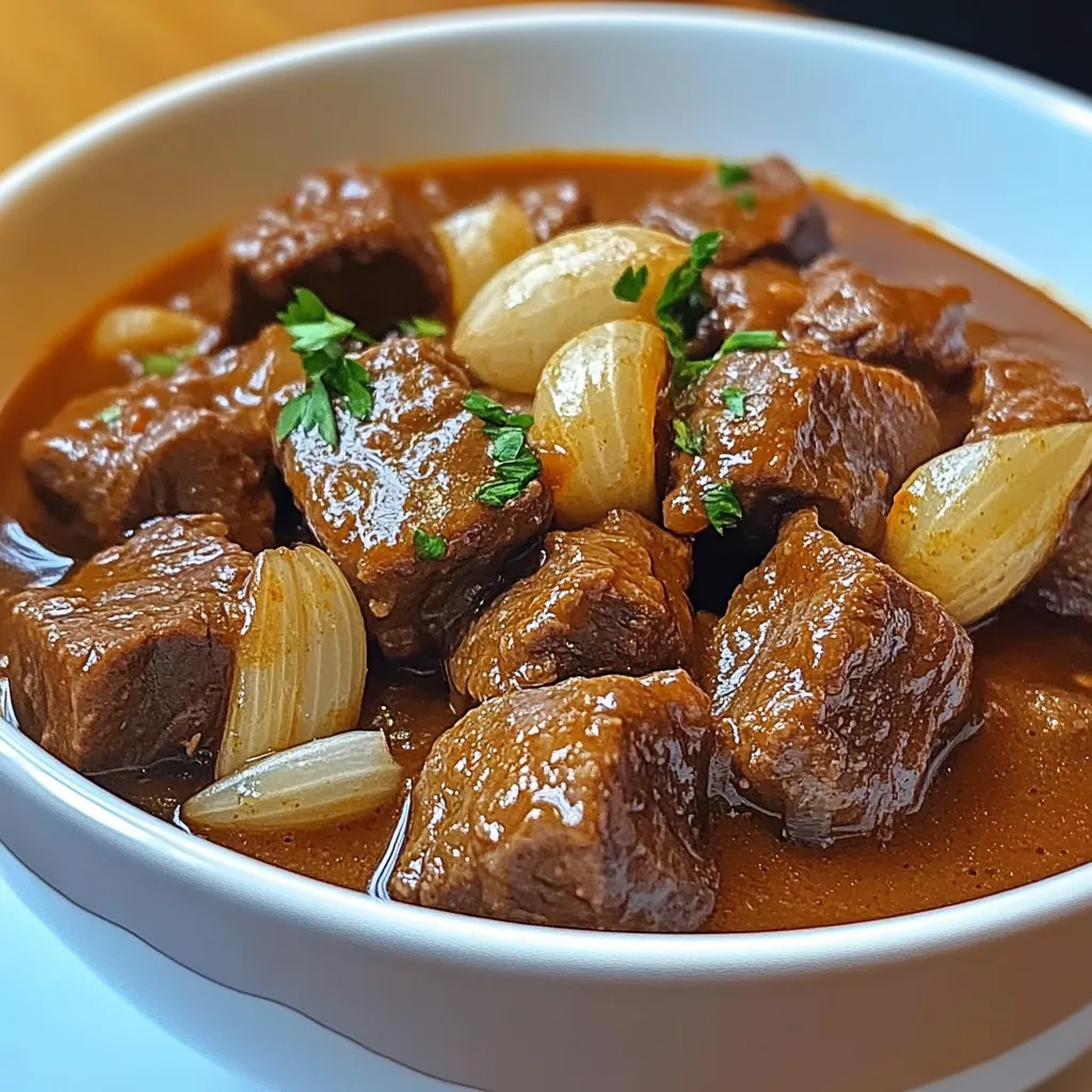 This stew is all about depth. The beef becomes incredibly tender, almost falling apart with a spoon. The sauce is rich and slightly velvety, with layers of flavor from the slow cooking. The onions melt into the stew, giving it a subtle sweetness that balances the savory broth.
