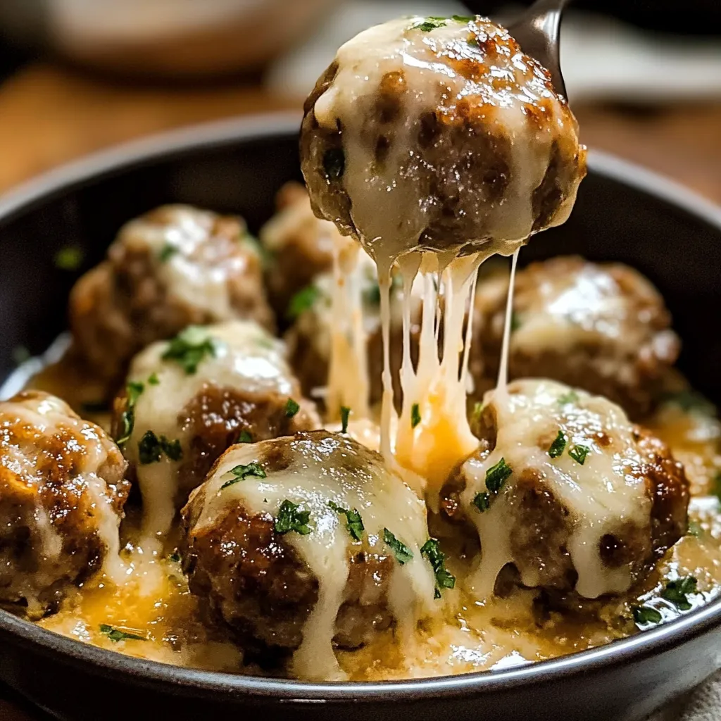 These meatballs are best enjoyed right away while the cheese is still warm and stretchy. I love serving them with crusty bread to soak up the onion gravy, or spooned over mashed potatoes or buttered noodles. They also pair beautifully with a green salad for balance.