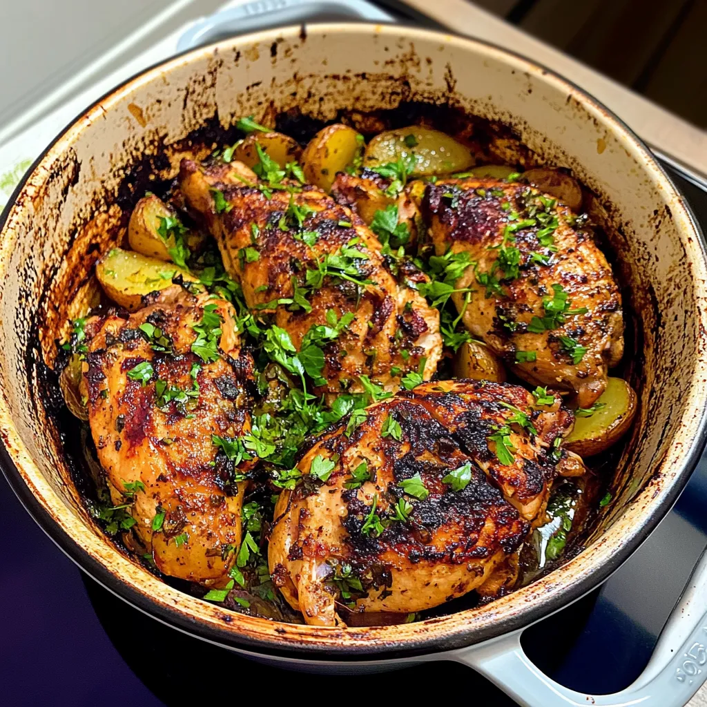 You’ll know it’s ready when the chicken skin is deeply golden, the juices run clear, and the potatoes are tender with crispy edges. If you want extra crispiness, switch on the broiler for the last 3–5 minutes—just keep an eye on it so nothing burns.
