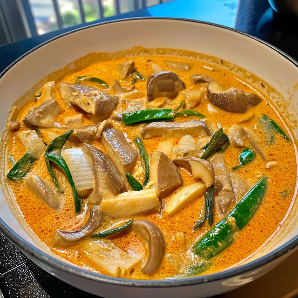 Serve this creamy red curry hot over fluffy jasmine rice. The rice absorbs the rich sauce beautifully, making every bite comforting and flavorful.