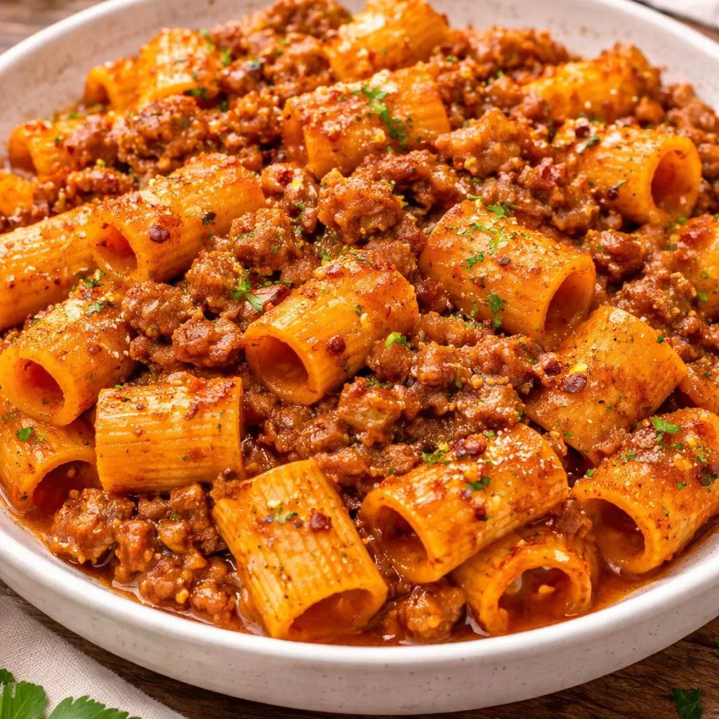 While this recipe doesn’t dry like candy, the goal here is to let the sauce cling beautifully to the pasta. Toss gently but thoroughly so each rigatoni tube fills with sauce. You want that glossy finish where the beef and pasta look shiny and well-coated, not watery.