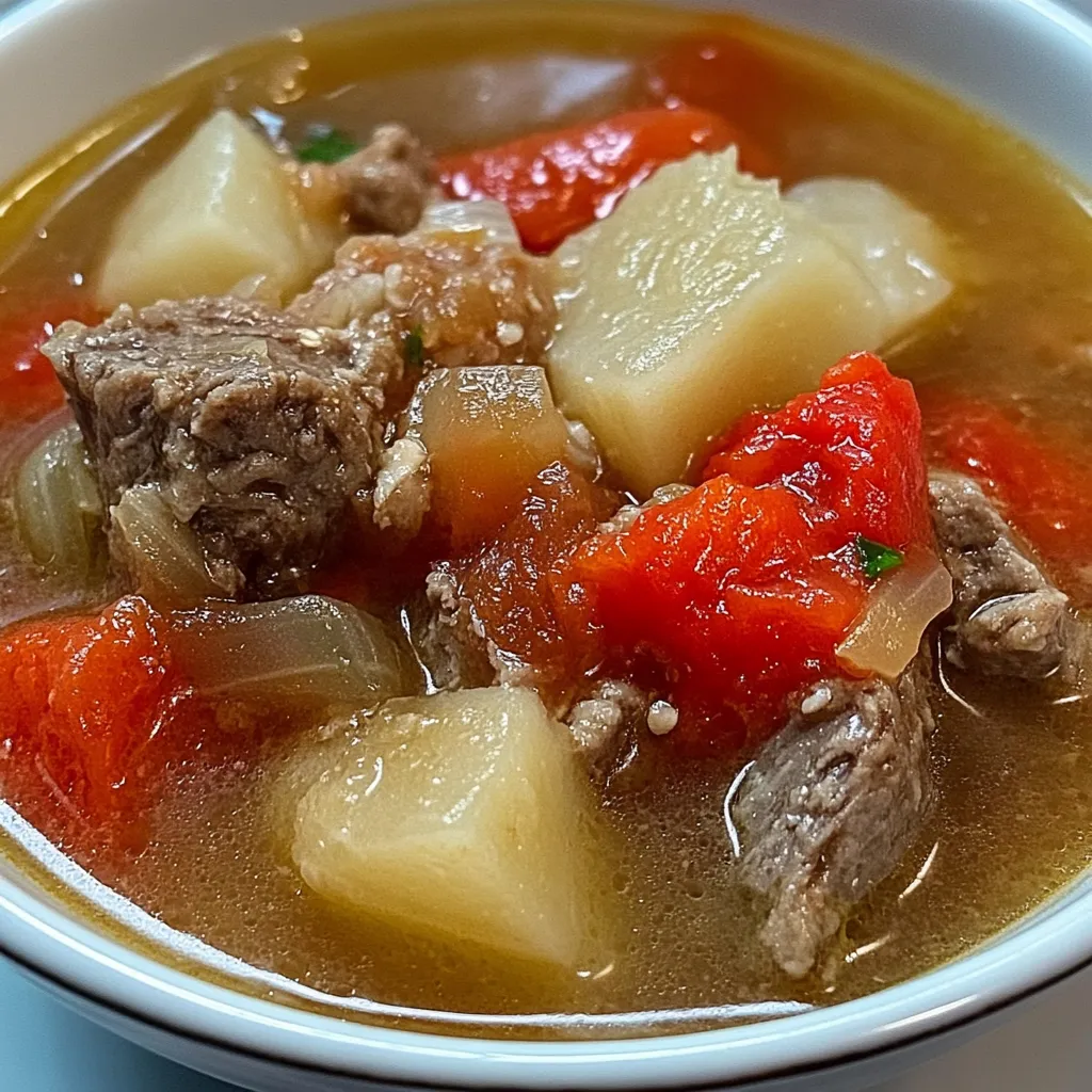This soup is rich in protein from the beef, vitamins from tomatoes and onions, and energy from potatoes. It’s a balanced, hearty dish that works well as a full meal, especially on cooler days when you want something warming and nourishing.