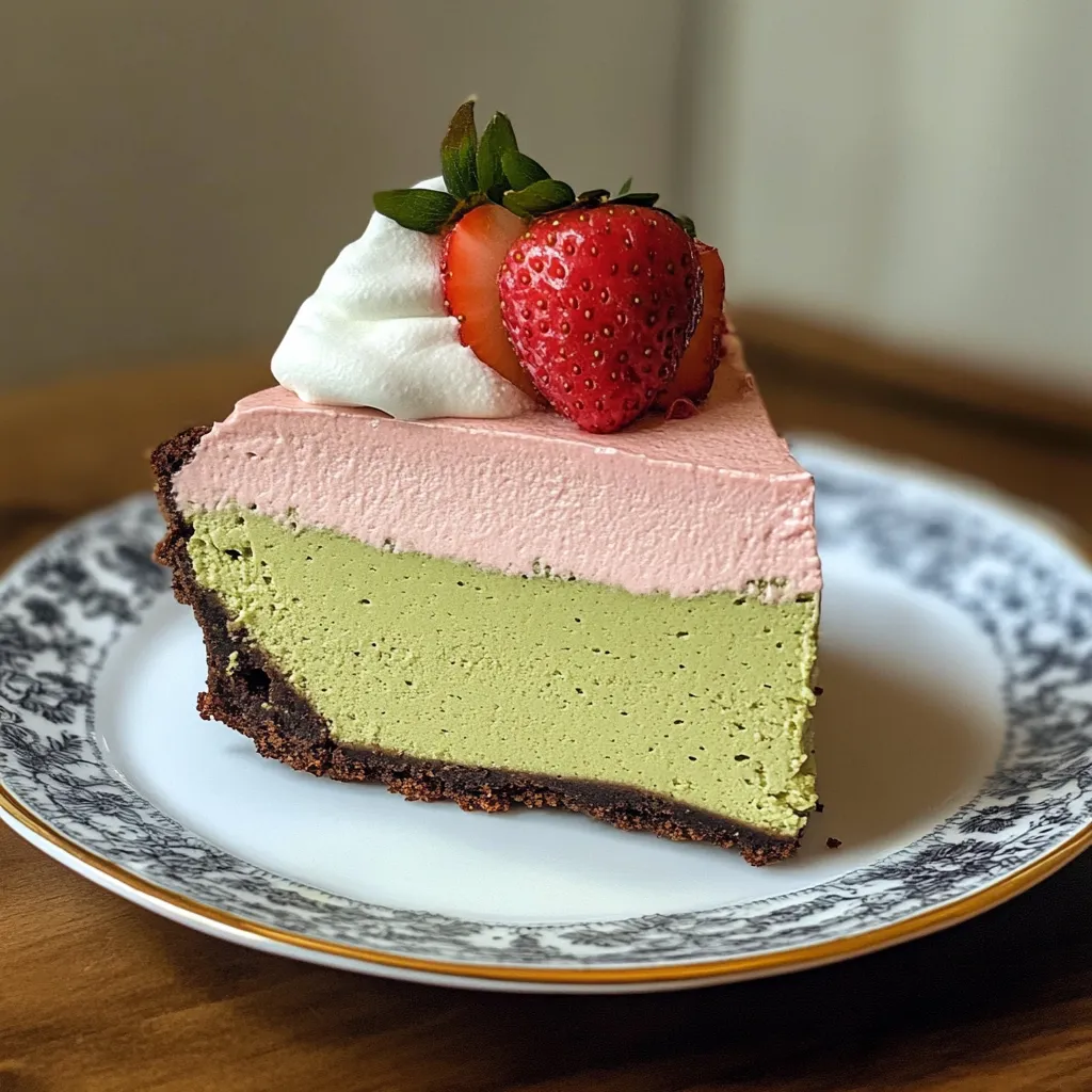 Once the cheesecake is fully chilled, spread the strawberry cream in a generous, swoopy layer across the top. Add a fresh strawberry in the center or decorate with slices around the edges. The combination of earthy matcha and bright berries looks just as lovely as it tastes.