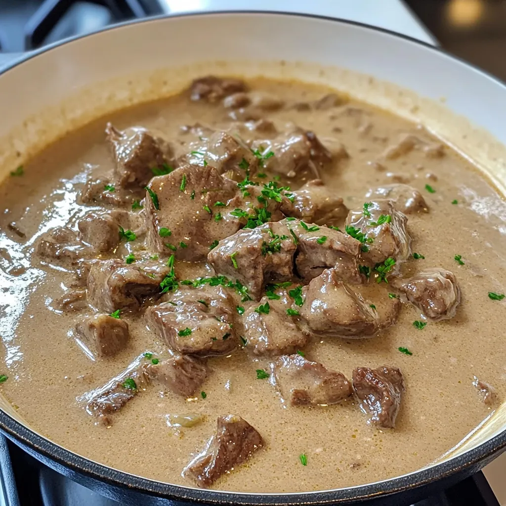By the end of cooking, the beef should be soft enough to cut with a spoon. The sauce will be smooth, creamy, and slightly glossy, coating every piece beautifully. The aroma is rich and comforting, with hints of mushroom, butter, and warm cream.
