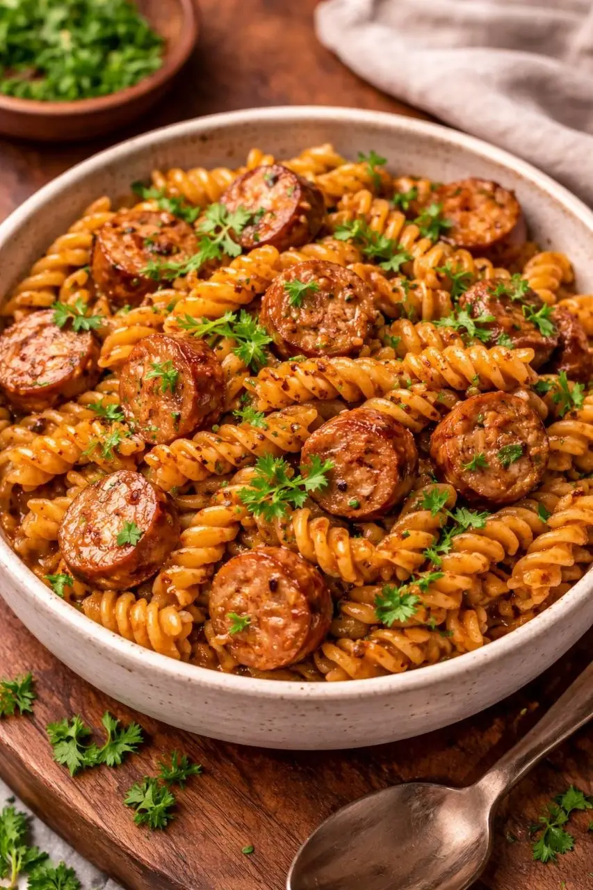 This recipe uses everyday ingredients, but together they create a sauce that tastes far more complex than it is. Choose a sausage you enjoy—smoked, chicken, or beef all work beautifully here.